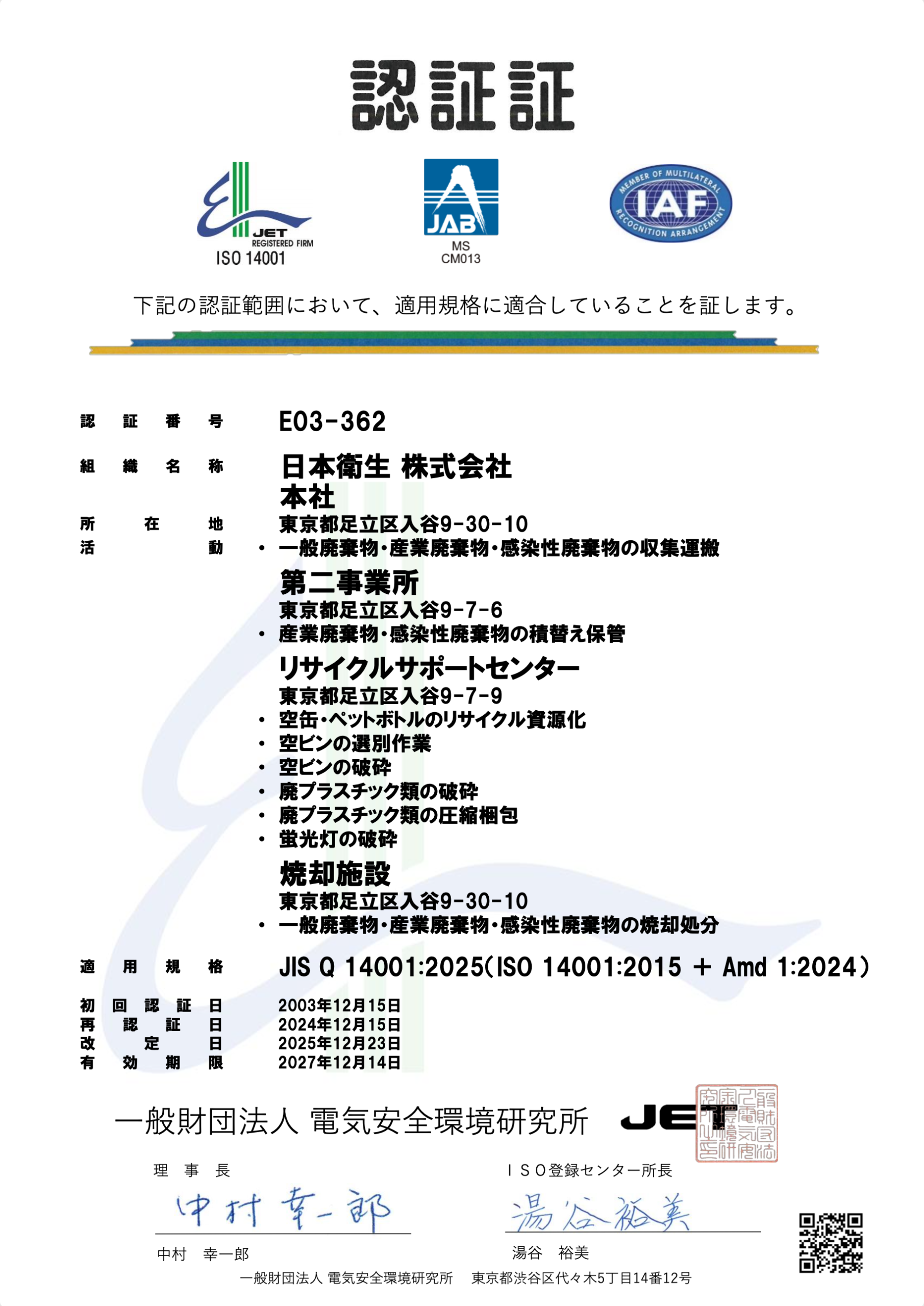 | 登録範囲 | 本社・第二事業所・リサイクルサポートセンター・焼却施設 |