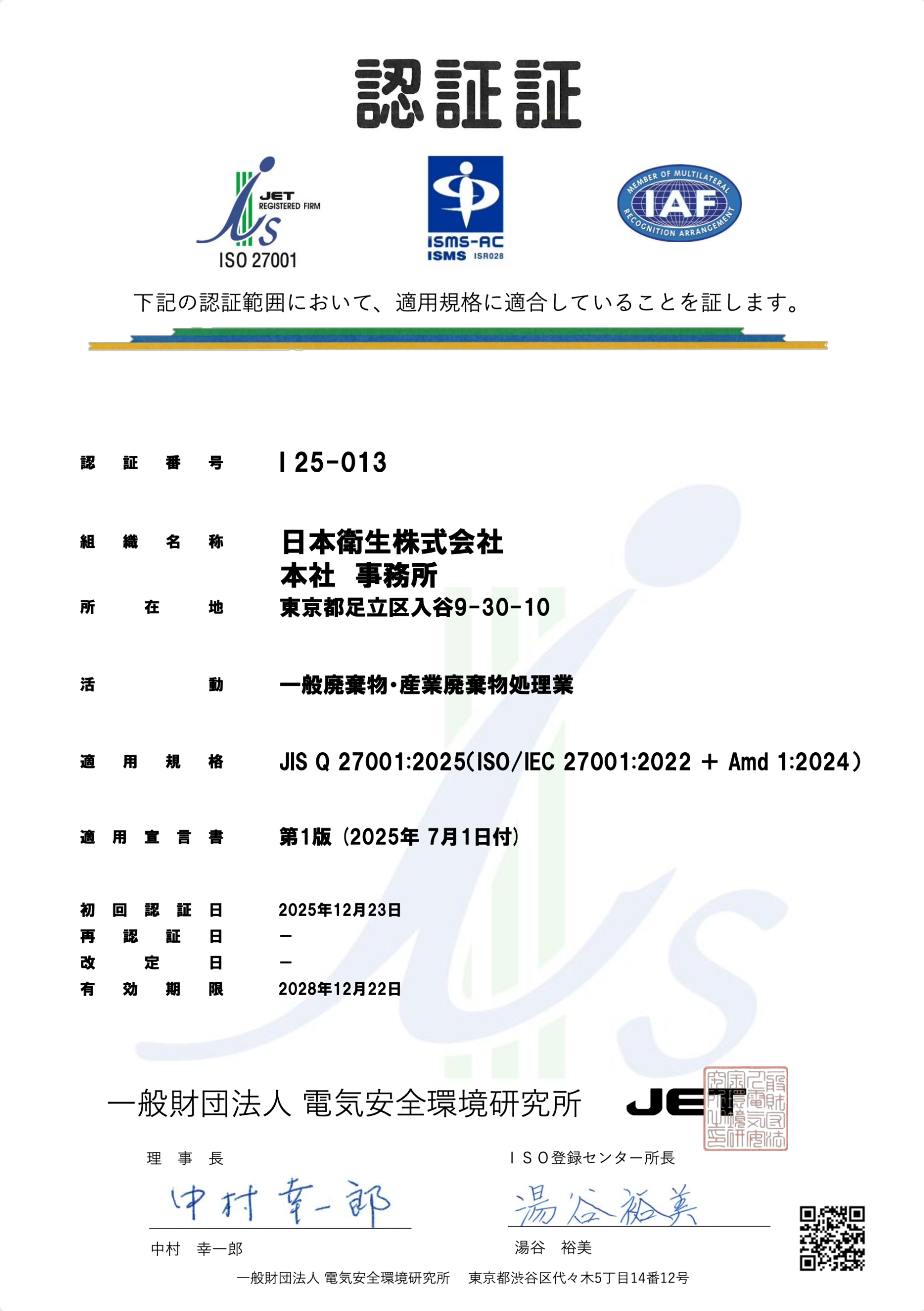 | 適用規格 | JIS Q 27001:2025(ISO/IEC 27001:2022 + Amd 1:2024) |