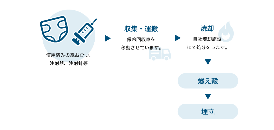 日本衛生では、医療機関から排出される廃棄物の分野でも早くから許可を受け、以下の業務を行っております。
