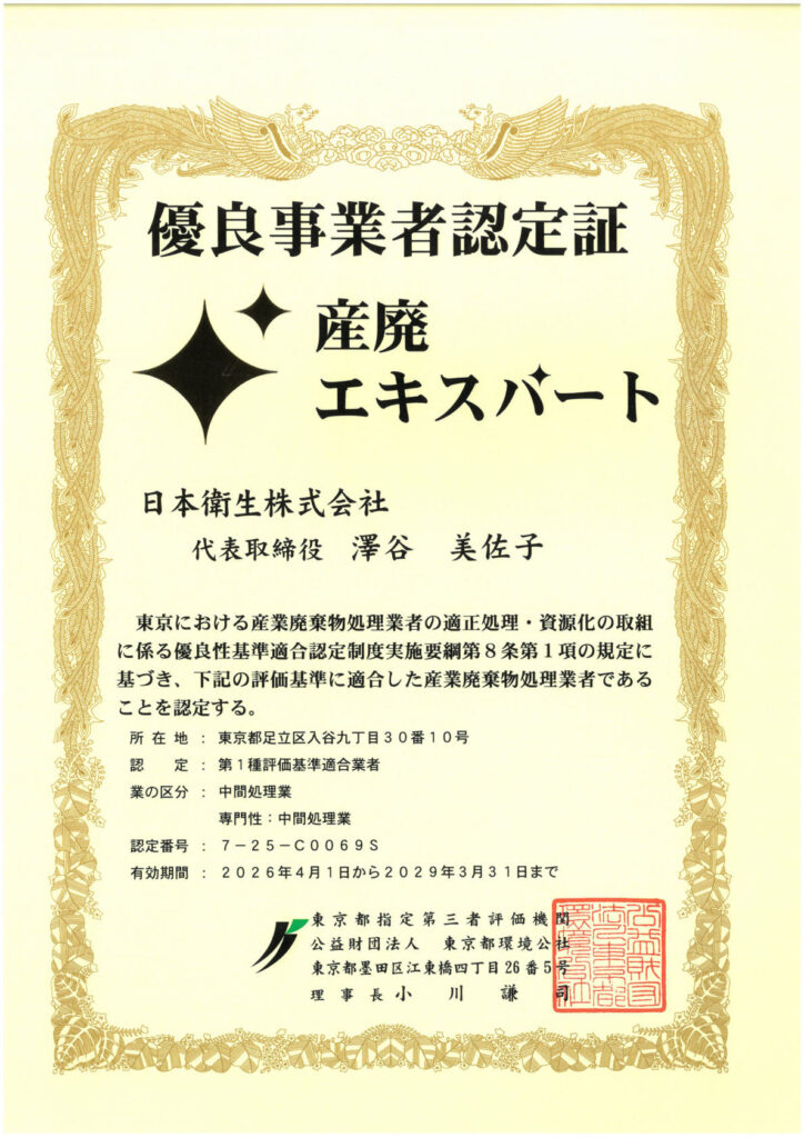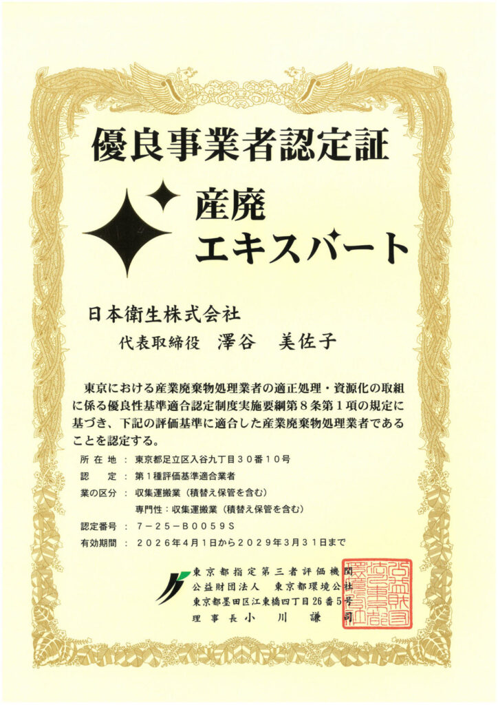 日本衛生株式会社は、東京都より「産廃エキスパート」の認定を頂きました。